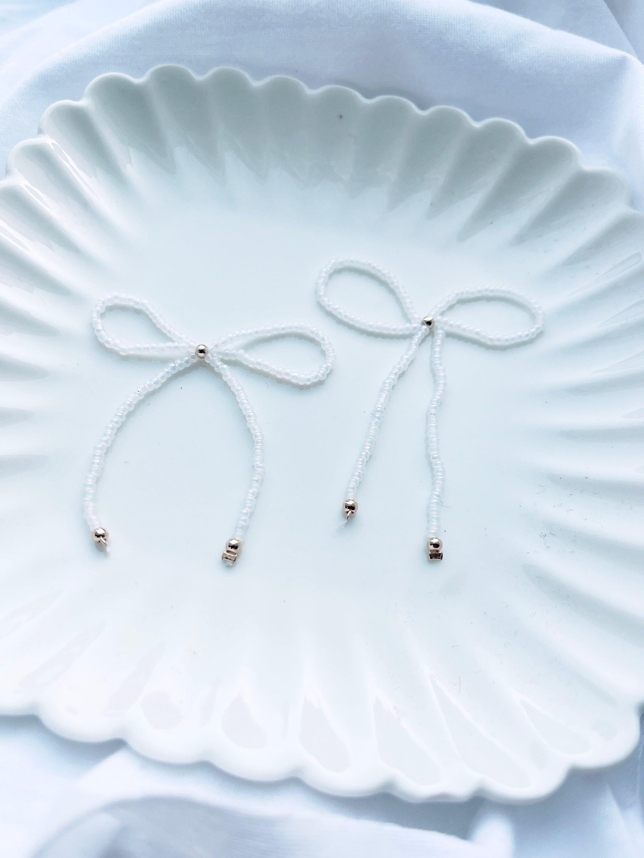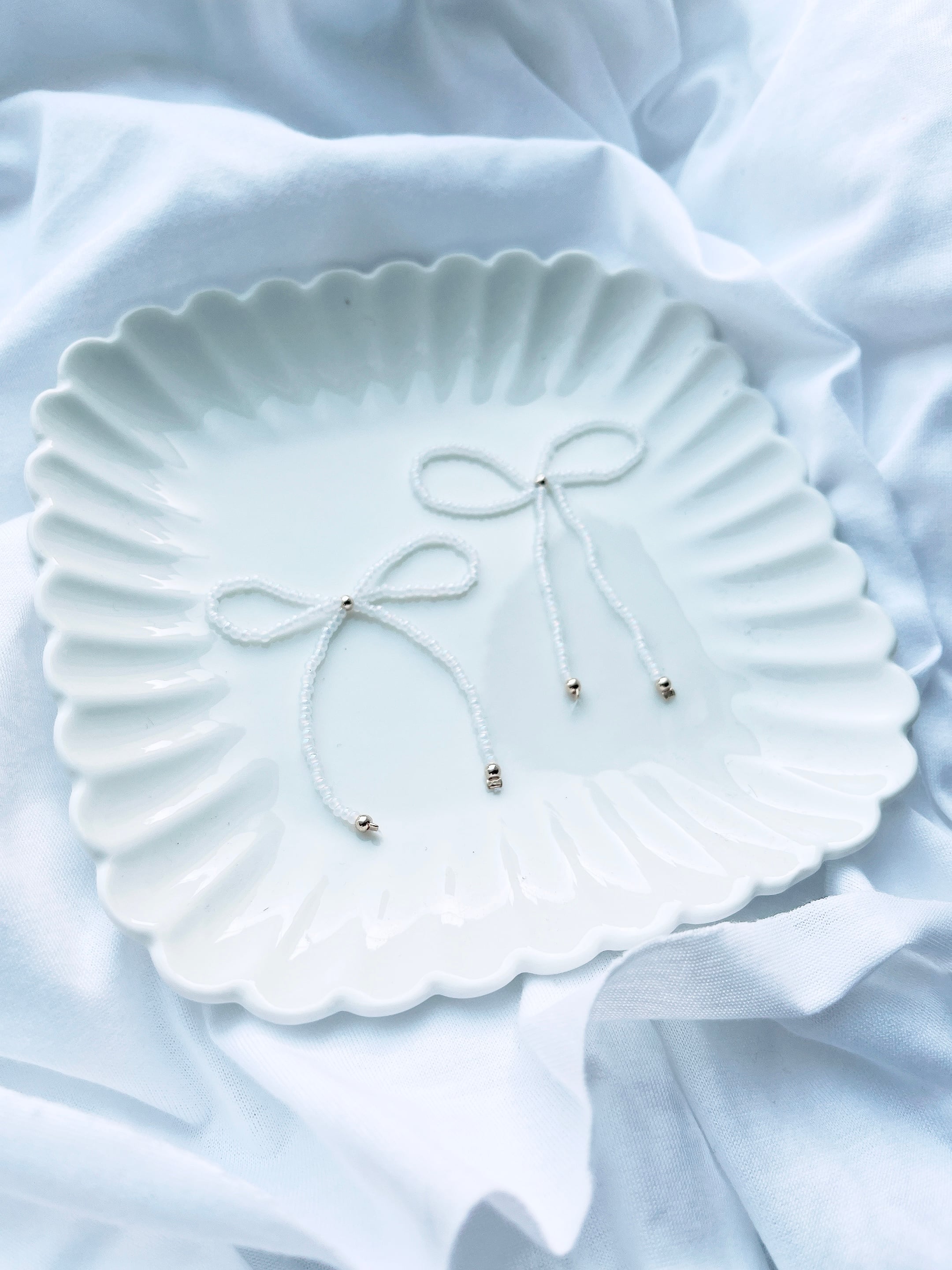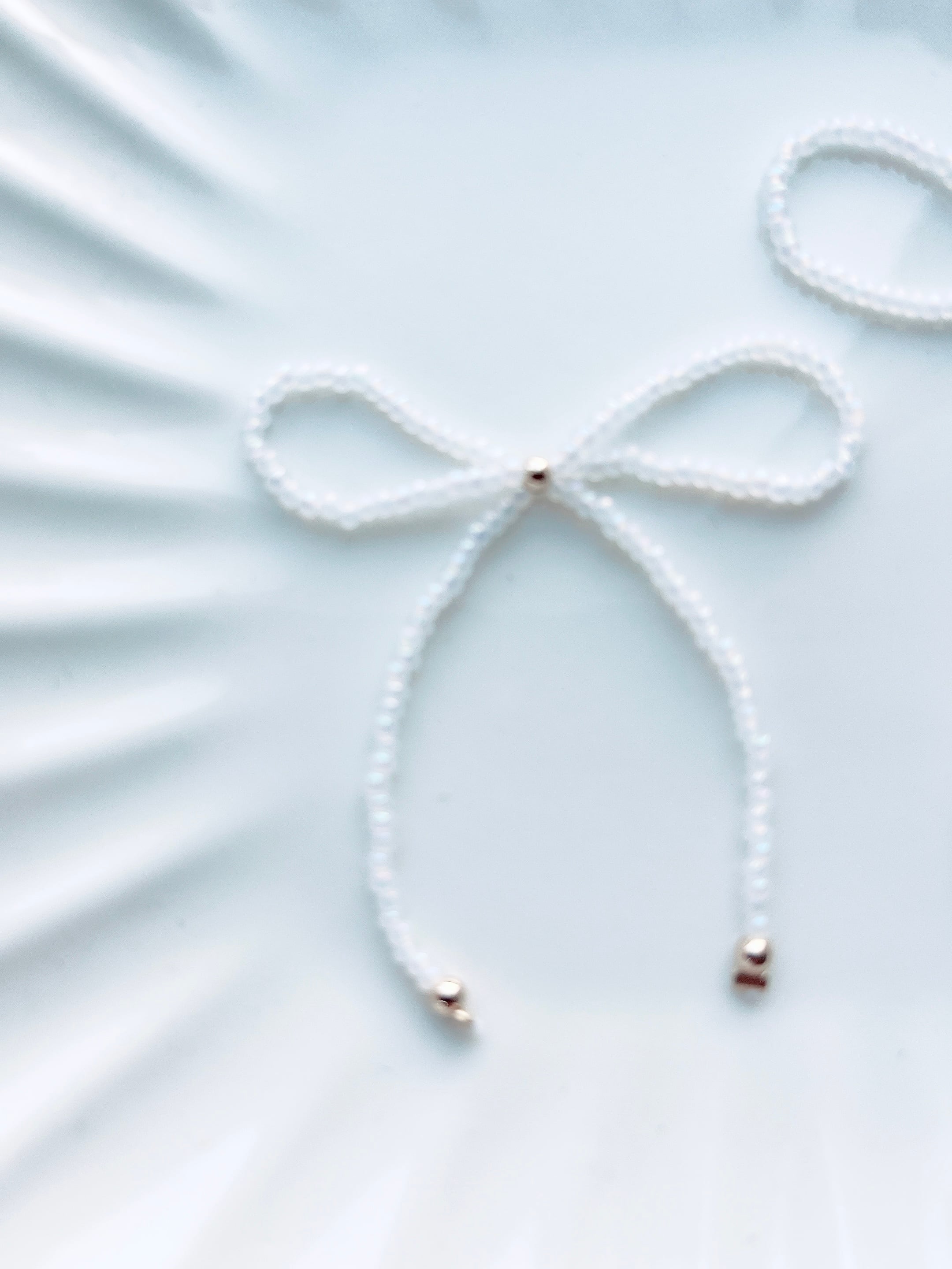 繊細なホワイトビーズを使って、一つ一つ丁寧に仕立てた美しいリボンです。たらんとした長いフォルムが特徴的で、どんなスタイルにもマッチします。