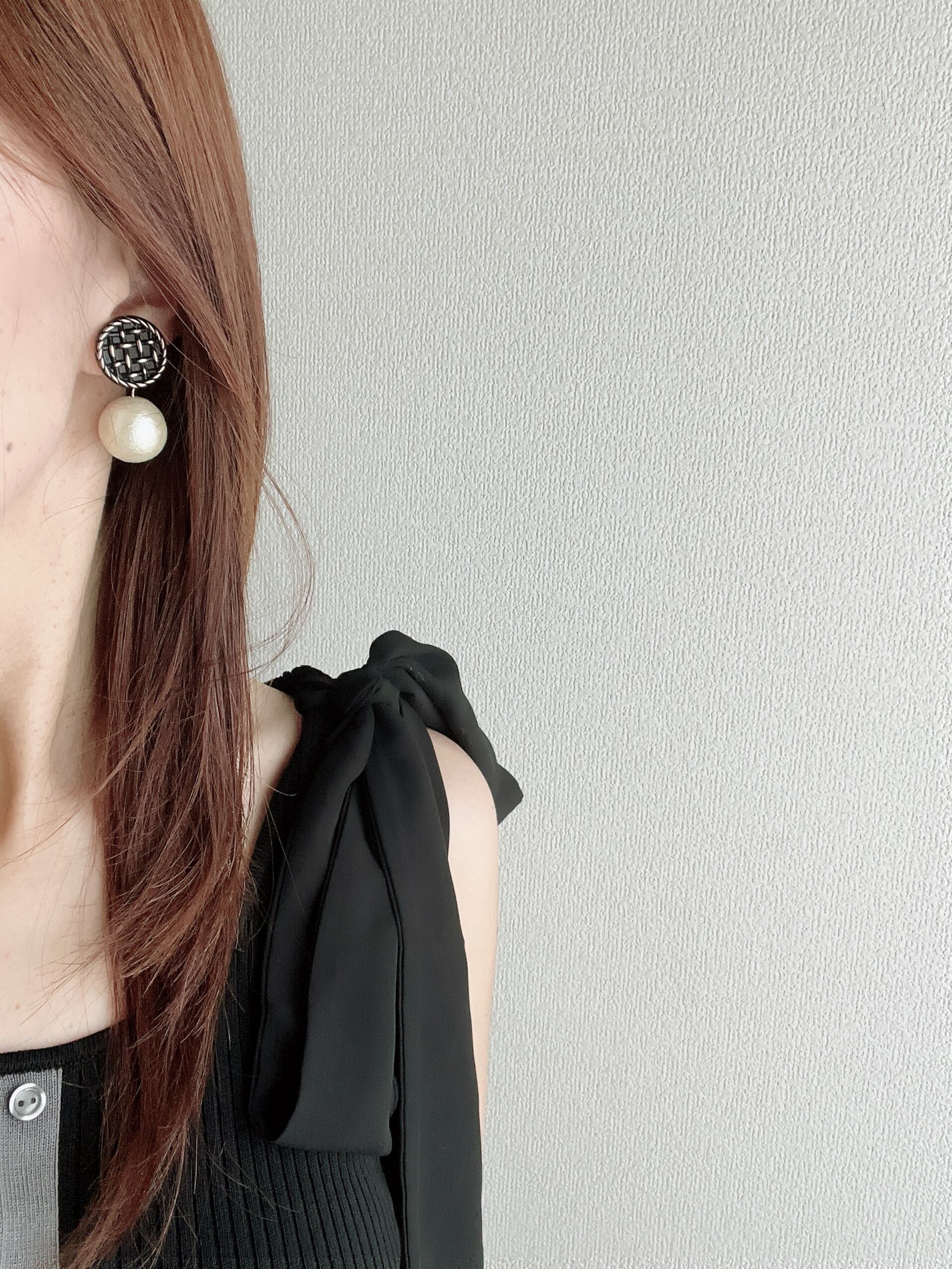 ゴールド、ブラックのボタンと 大きなコットンパールを合わせた 大ぶりなアクセサリー。 大玉だけど、コットンパールなので とっても軽いです。 存在感もあり、華やかなにしてくれます! ブラックはかっこよく ゴールドは顔まわりを キラキラさせてくれます。